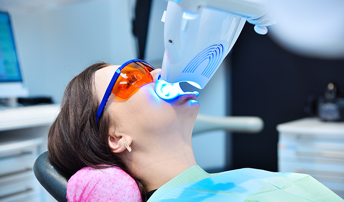 トランセントホワイトニングは、過酸化水素を一切使用せず、医療用高出力パルス青色LED光の照射によって歯の着色を分解する最新のホワイトニング法です。